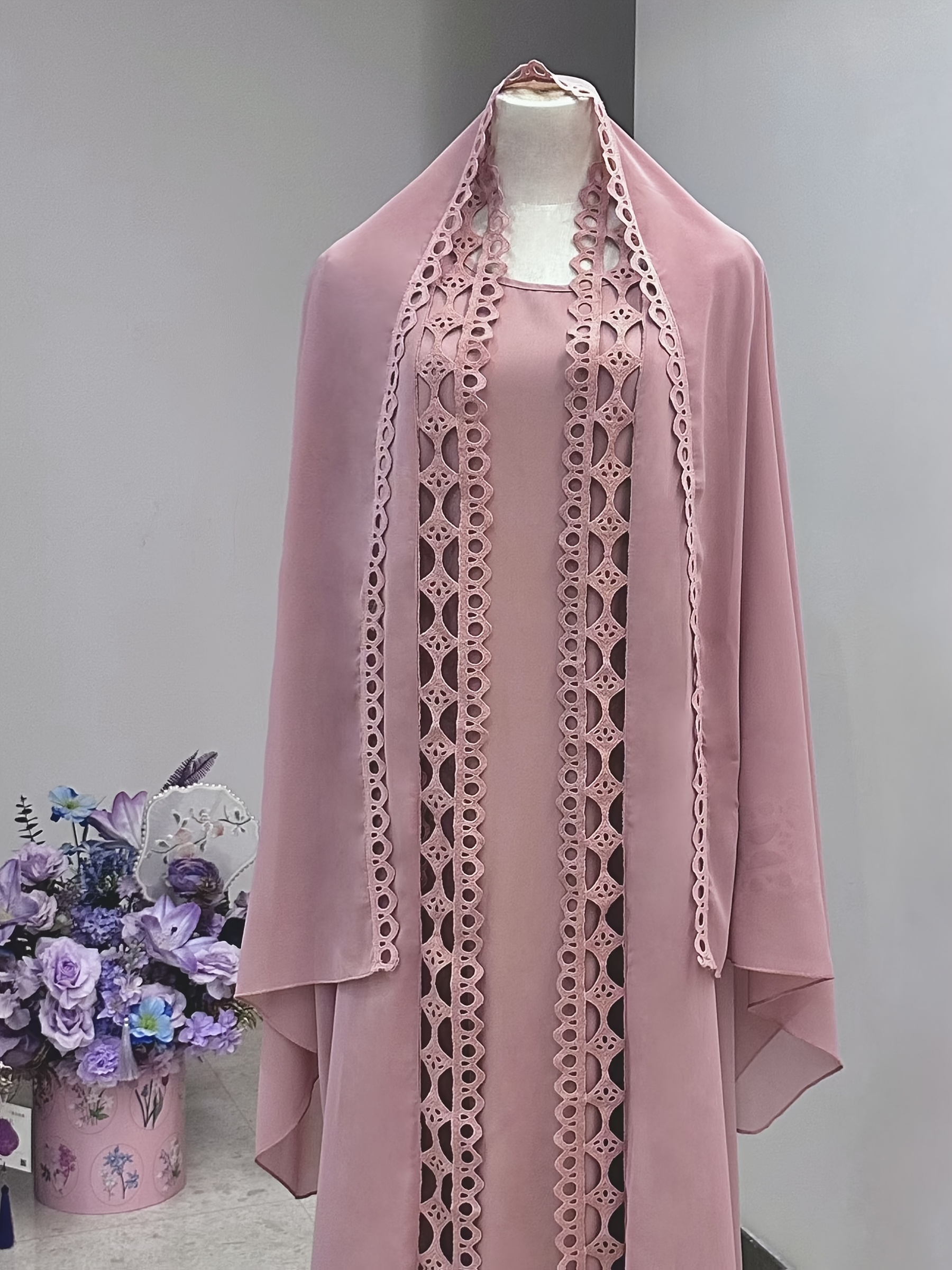 Middle Eastern Muslim Fashion Long Sleeve Embroidered Contrast Lace Patchwork Abaya Dress and Hijab Three-Piece Set