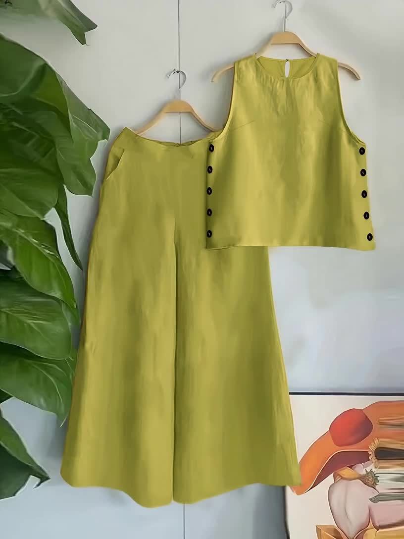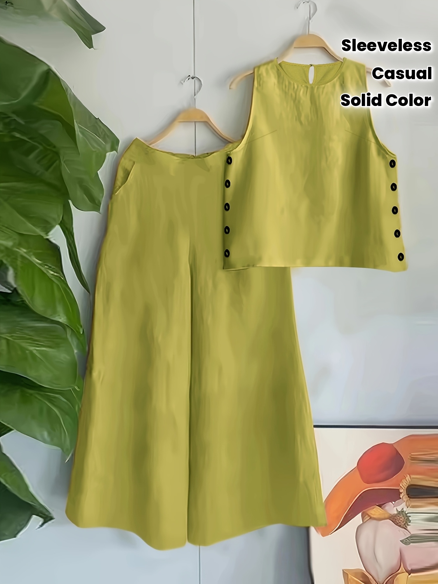 Vacation-Style Solid Color Sleeveless Women's Casual Pants Set