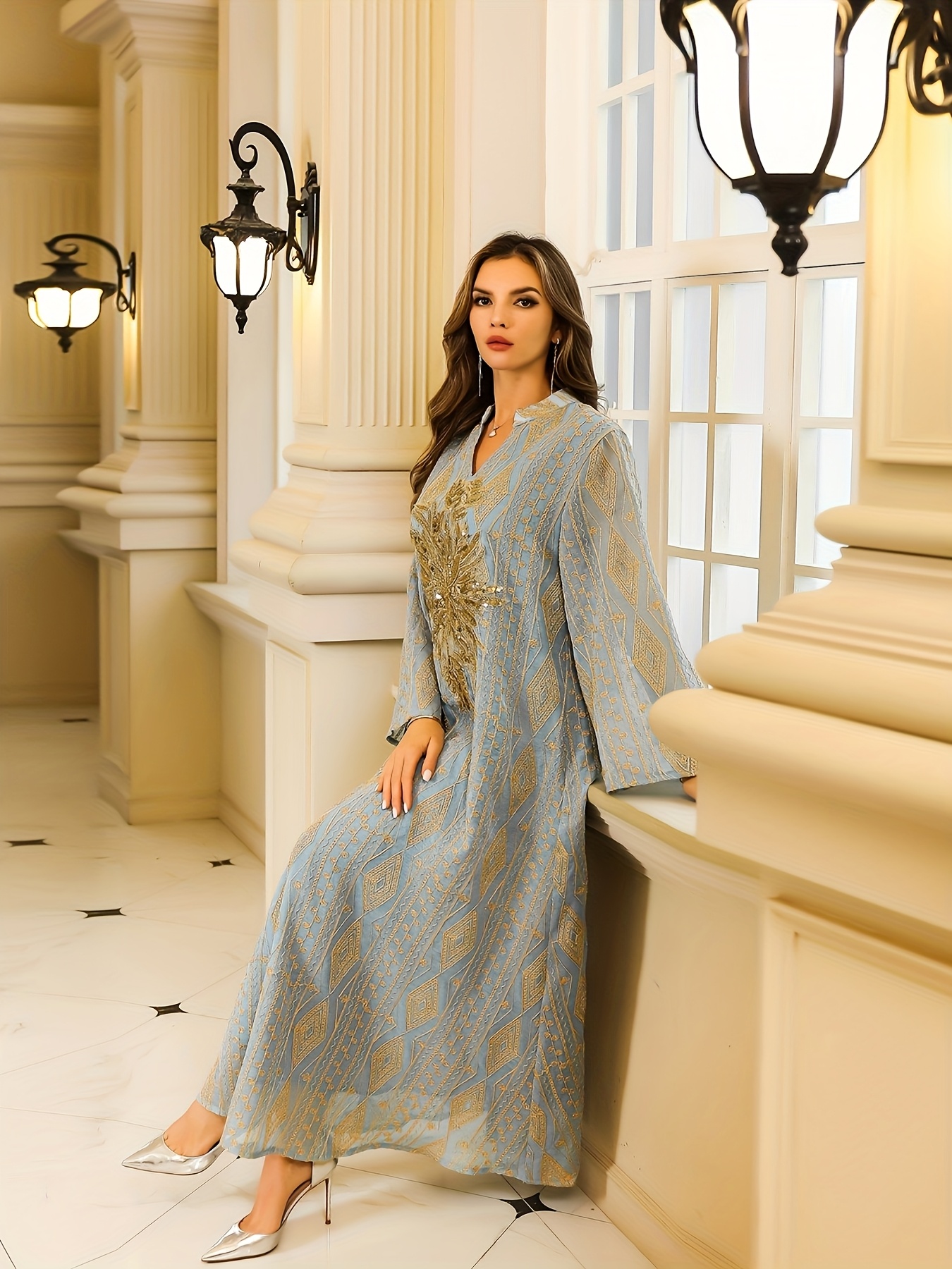 Luxury Muslim Women's Abaya Toga Dress with Golden Embroidery - Middle Eastern Style Long Sleeve Polyester Gown for Weddings & Formal Events, Loose Fit, Geometric Pattern, Hand Wash or Dry Clean, Muslim Clothes