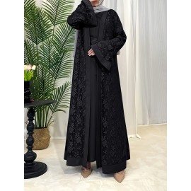 Middle Eastern Muslim Fashion Long Sleeve Embroidered Contrast Lace Patchwork Abaya Dress and Hijab Three-Piece Set
