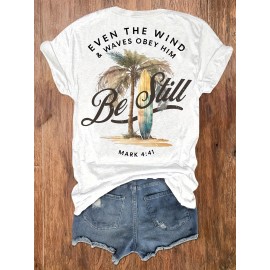 Women's Casual Graphic Print T-Shirt - Short Sleeve Crew Neck, Summer & Spring Essential, White with Palm Tree Design, Machine Washable, Medium Stretch Fabric, Relaxed Fit Top | Vacation Style Shirt | Nontransparent Material