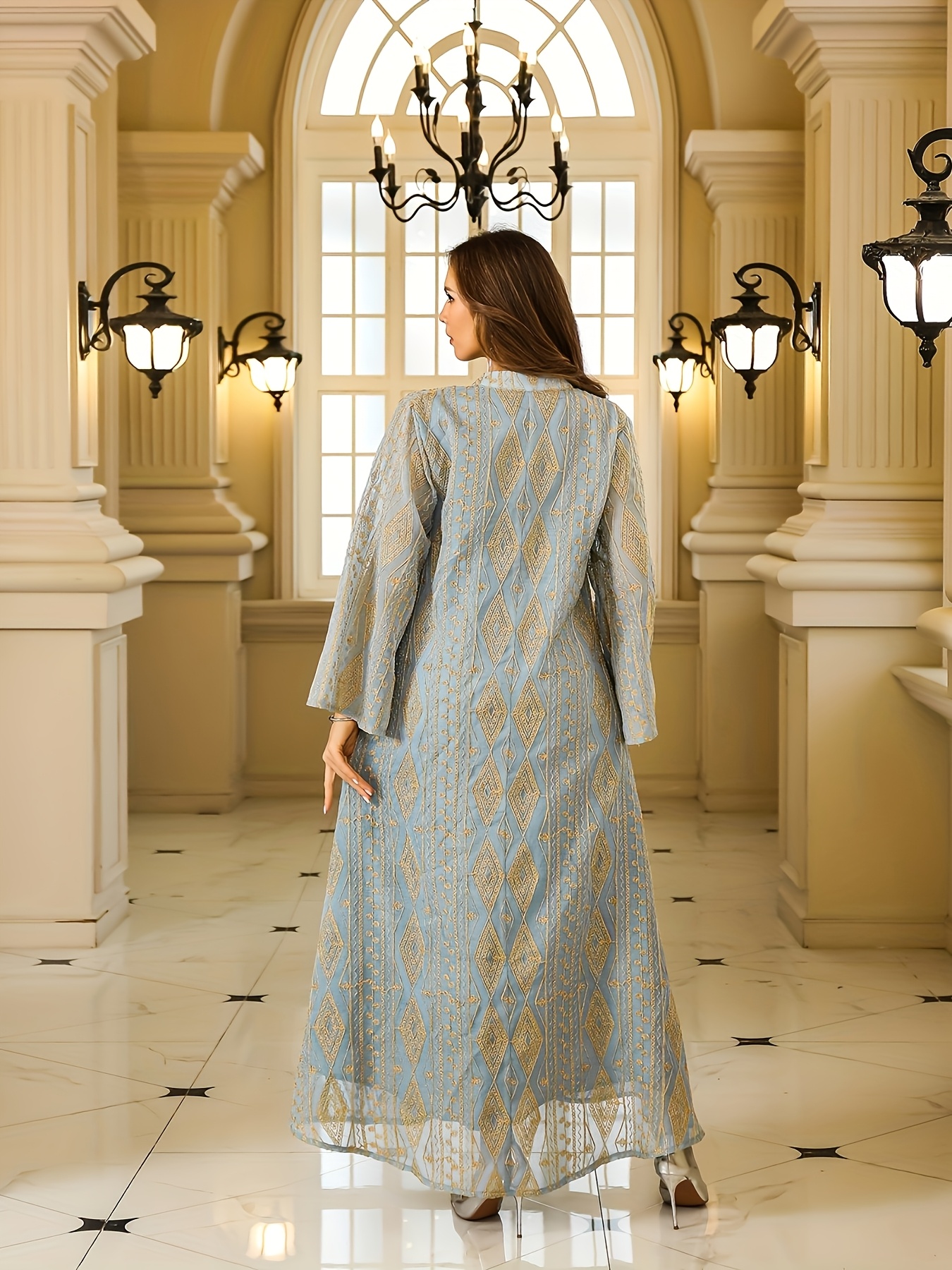 Luxury Muslim Women's Abaya Toga Dress with Golden Embroidery - Middle Eastern Style Long Sleeve Polyester Gown for Weddings & Formal Events, Loose Fit, Geometric Pattern, Hand Wash or Dry Clean, Muslim Clothes